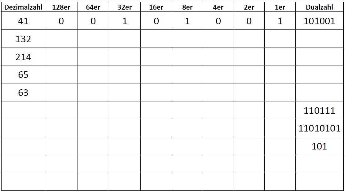 1. Rechne die Dezimal- und Dualzahlen in der Tabelle entsprechend um. Lade dir die Tabellen hier herunter oder mache dir einen Screenshot. Überlege dir am Ende noch zwei eigene Zahlen und rechne sie um.