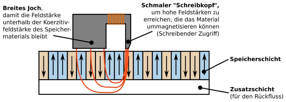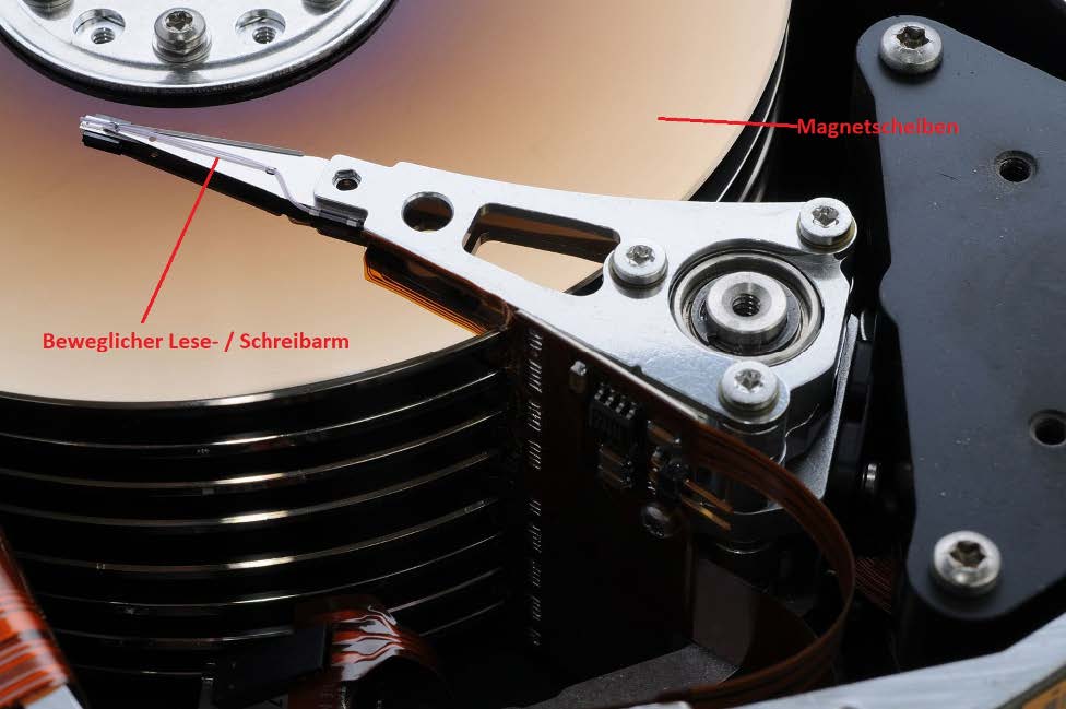 Die Magnetscheiben kann man sich wie eine Schallplatte vorstellen. Die Speicherbereiche sind wie kreisförmige Bahnen auf den Scheiben angeordnet. Der Lese- / Schreibkopf magnetisiert einen kleinen Bereich oder nicht. So werden Informationen auf den Scheiben hinterlegt. Zum Beispiel könnte ein Teil einer Bahn wie folgt magnetisiert sein ('m' steht für magnetisiert und 'n' für nicht magnetisiert): ...mmnnmnmmnnnmnnnmnmnmmmn... Der Lese- / Schreibkopf kann seine Höhe verändern und so auch andere Scheiben des Scheibenstapels ansteuern. Da die Speicherung der Daten magnetisch funktioniert, bleiben die Daten auch ohne Stromversorgung auf der Festplatte. Eine Festplatte ist wesentlich langsamer beim Lesen und Schreiben, als ein Arbeitsspeicher, da sich der Arm physikalisch bewegen muss. → Eine Festplatte soll Informationen langfristig speichern In den kleinen schwarzen Chips des Arbeitsspeichers sind eine Vielzahl Kondensatoren verbaut und miteinander verbunden. Ein Kondensator kann in seinem Innern Ladungen speichern oder nicht. Dies kann für jeden einzelnen Kondensator überprüft werden. Zum Beispiel könnte eine Reihe von Kondensatoren wie folgt Strom gespeichert haben ('l' steht für Ladung gespeichert und 'n' für keinen Ladung gespeichert). ...nlllnlnlllnnnl... Die verbauten Kondensatoren verlieren ihre Ladung schnell, wenn keine Stromversorgung angeschlossen ist. Deshalb gehen bei gängigen Arbeitsspeichern die gespeicherten Informationen verloren, wenn die Stromversorgung unterbunden wird. Arbeitsspeicher ist deutlich schneller, als eine Festplatte. → Arbeitsspeicher soll Informationen verarbeiten
