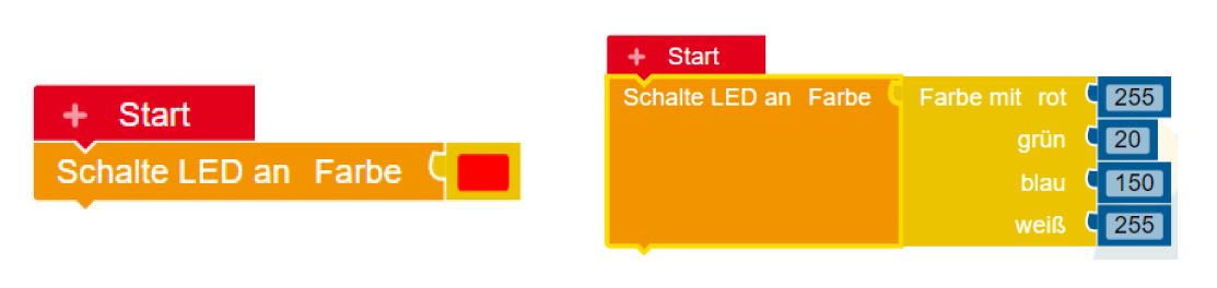Mithilfe der rechten Methode können viel mehr Farben ausgewählt werden als links. Um zu verstehen, wie man durch die Angabe von den drei Zahlen eine Farbe auswählt, müssen wir uns die Farb-LED etwas genauer anschauen. Mögliche Werte für den Rot-, Grün- und Blauanteil der Farbe sind im Bereich von 0 bis 255. Schaue dir hier die Erklärung an und probiere auf der Seite die Regler für die Farben Rot, Grün und Blau ein wenig aus. Probiere nun auch die entsprechenden Werte mit dem Block oben rechts auf deinem Calliope aus. (Der Wert für weiß ist für uns egal und bleibt immer auf 255.) (Zusatz: Kannst du auch verschiedene Grautöne erzeugen?)