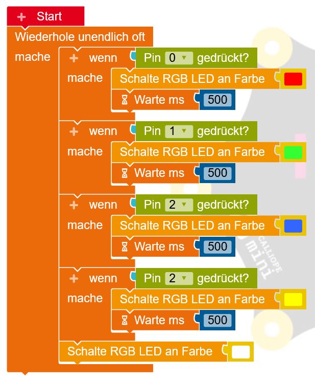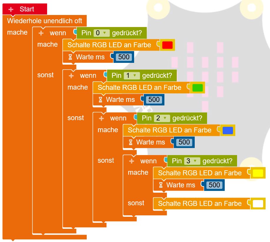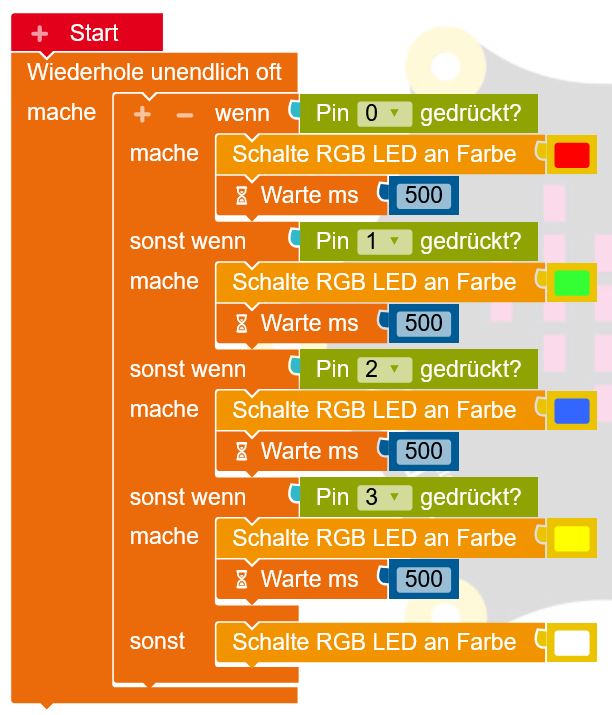 auf Berührung) berührt wird, soll die RGB-LED kurz leuchten, bei Pin 1 grün, bei Pin 2 blau, bei