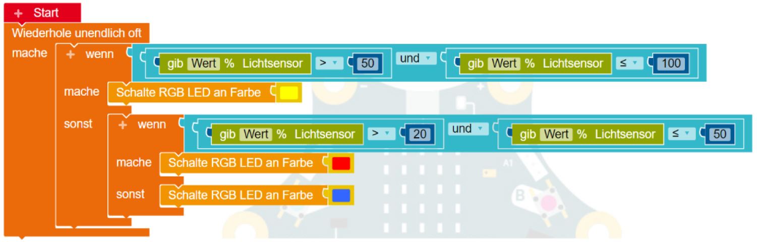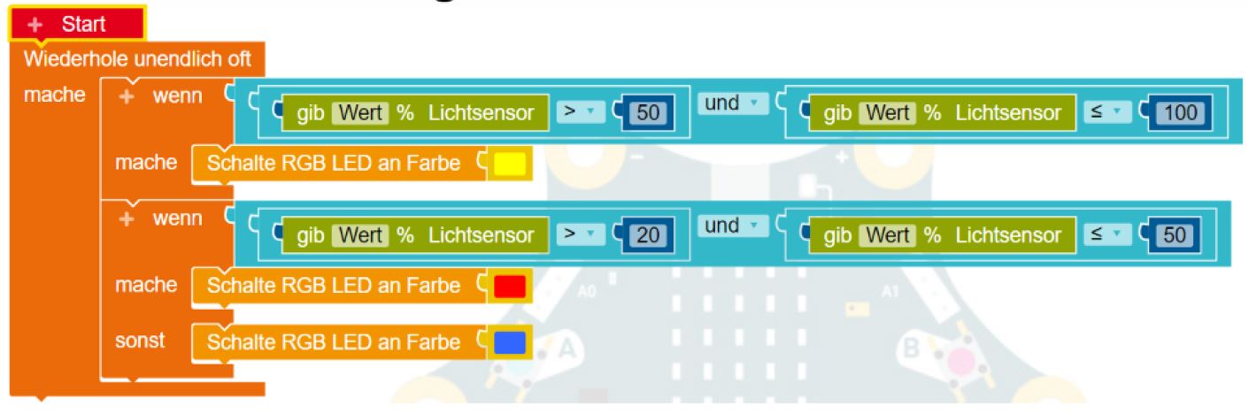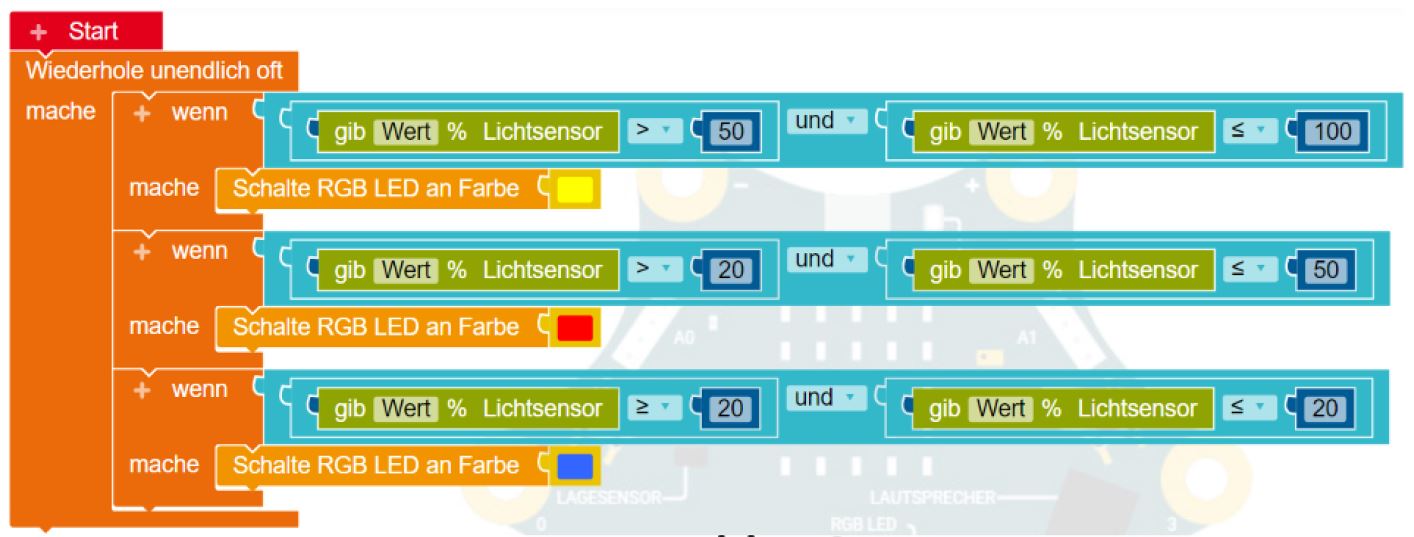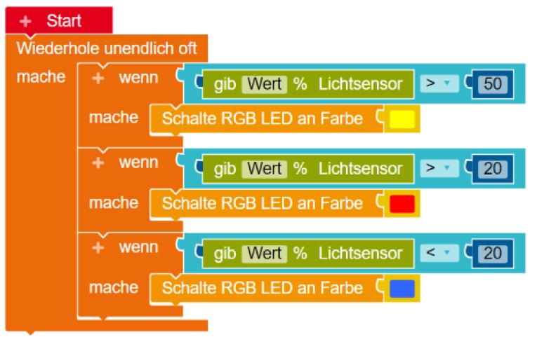 - Wenn der Wert des Helligkeitssensors größer als 50% ist, soll die RGB-LED gelb leuchten. Ist der Helligkeitswert kleiner oder gleich 50% und gleichzeitig größer als 20%, soll die RGB-LED rot leuchten. Ansonsten soll sie blau leuchten.