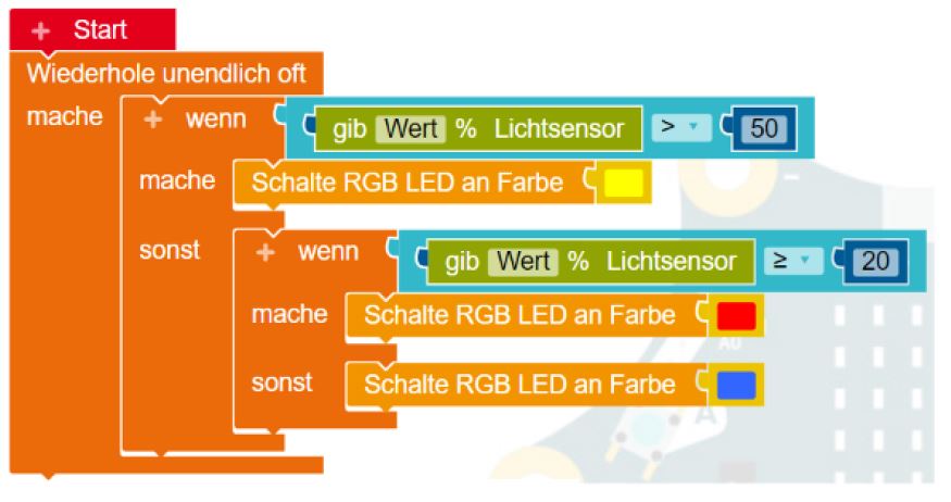 - Wenn der Wert des Helligkeitssensors größer als 50% ist, soll die RGB-LED gelb, ansonsten blau leuchten.