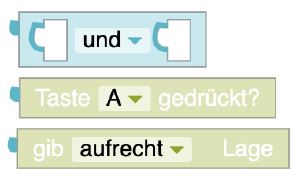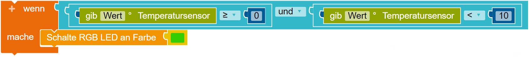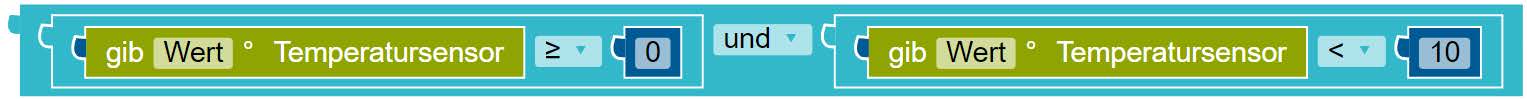 Mit diesem Block kann man zwei gleichzeitig geltende Bedingungen verknüpfen. Es soll z. b. im Temperaturbereich von 0° bis 10° die LED grün leuchten. Dann stellt man zunächst die Bedingung nacheinander auf: