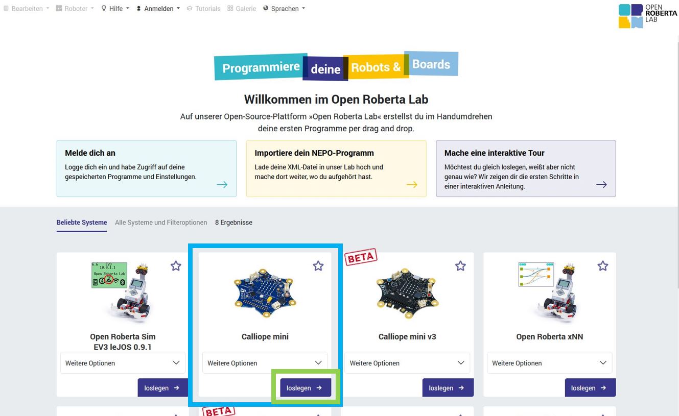 - Klicke dort beim Calliope mini (blauer Kasten) auf "loslegen" (grüner Kasten) und nun kannst du programmieren.