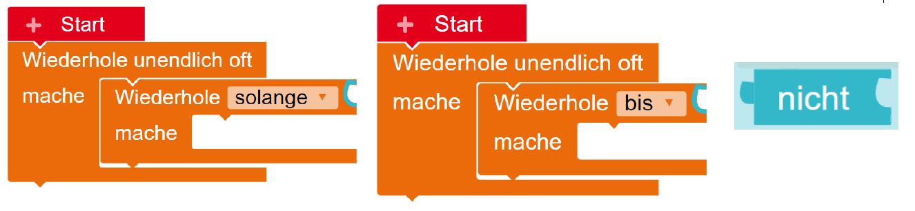 - Solange die Taste A gedrückt wird, soll die RGB-LED blau leuchten. Implementiere je ein Programm, welches entsprechend funktioniert, mit beiden bedingten Wiederholungen. Den "nicht"-Block kann man eventuell bei einer der Wiederholungsarten nutzen.