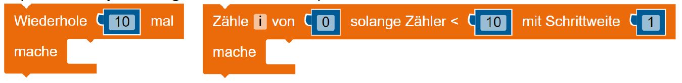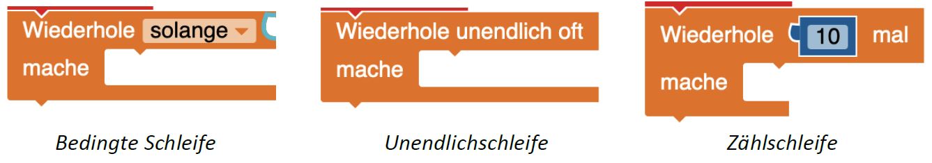 Häufig soll eine bestimmte Sequenz des Quellcodes nicht nur einmal, sondern mehrfach ausgeführt werden. Dazu werden Schleifen genutzt. In Open Roberta werden wir uns mit drei verschiedenen Schleifen beschäftigen, die in zwei Kategorien - Zählschleifen und Bedingungsschleifen - aufgeteilt werden. Du findest die Schleifenblöcke ebenfalls im Reiter „Kontrolle“.