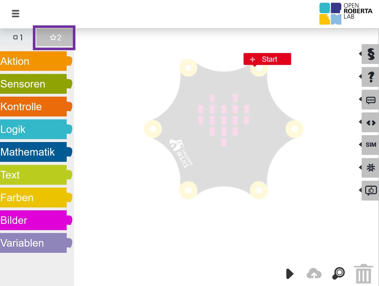 - Nun solltest du oben links auf die 2 klicken (Stern-Symbol, lila Kasten), um so mehr Blöcke zu erhalten. Wir werden immer in diesem erweiterten Modus programmieren.