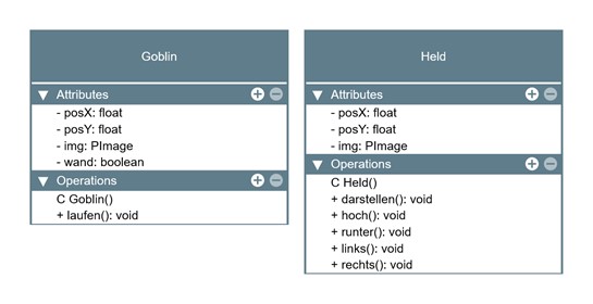 Unten sind zwei Klassenkarten gegeben. Eine Klassenkarte zeigt die Figur eines Goblins und die andere, die eines Helden. Der Datentyp float stellt Dezimalzahlen dar und der Datentyp PImage ermöglicht das Laden von Bilddateien. Es gibt jeweils eine Operation, die genau so heißt, wie die Klasse. Dabei handelt es sich jeweils um den Konstruktor (eng. Constructor –> deshalb das C vor der Operation). Der Konstruktor enthält quasi die Anleitung wie ein neues Objekt der Klasse Held beim Erstellen aufgebaut sein soll.